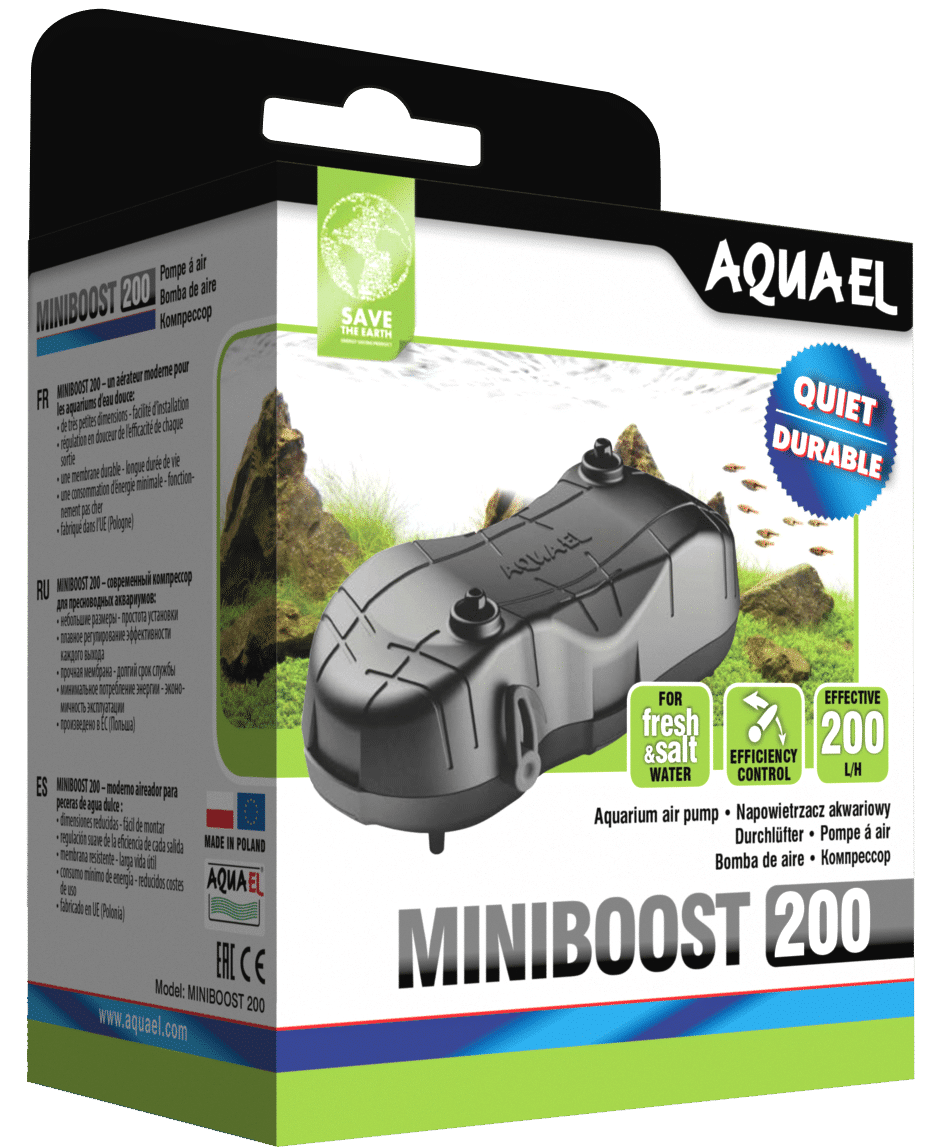 The Miniboost 100 is ideal for smaller aquariums (under 100 liters), while the Miniboost 200 is better suited for larger tanks up to 200 liters. Both pumps are great for providing additional oxygenation, which is important for fish health and overall aquarium maintenance.