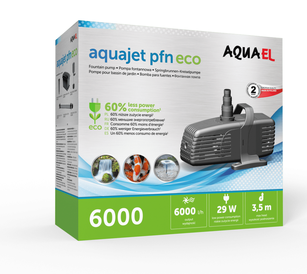 5. Cost-Effective Operation: The combination of low power consumption and high flow rate ensures that the Aquael PFN Eco pumps are cheap to run, offering substantial savings over time. Even the largest model in the range, the Aquael PFN Eco 25,000, with its massive 25,000 liters per hour flow rate, consumes just 180 watts of power, making it an economical choice for maintaining large ponds or water features.
