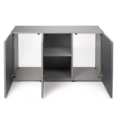 Glossy aquarium cabinets are more than just furniture; they are elements that give your space a new dimension. The elegant, high-gloss gray fronts of the cabinet showcase the beauty of the aquarium’s aquascape and create a harmonious look within your apartment or office. The cabinet doors are color-matched to the gray finish of the tank, giving the entire set a unified appearance, while the glossy finish emphasizes its modern elegance.