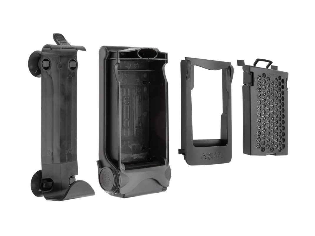 The filter uses a useful mounting solution. The rack attaches with 4 suction cups. Meanwhile, the basket with the filter module smoothly slides out when pressed. This makes it very easy to service the filter – the motor stays in the water all the time, while the filter element can be removed and cleaned or replaced.