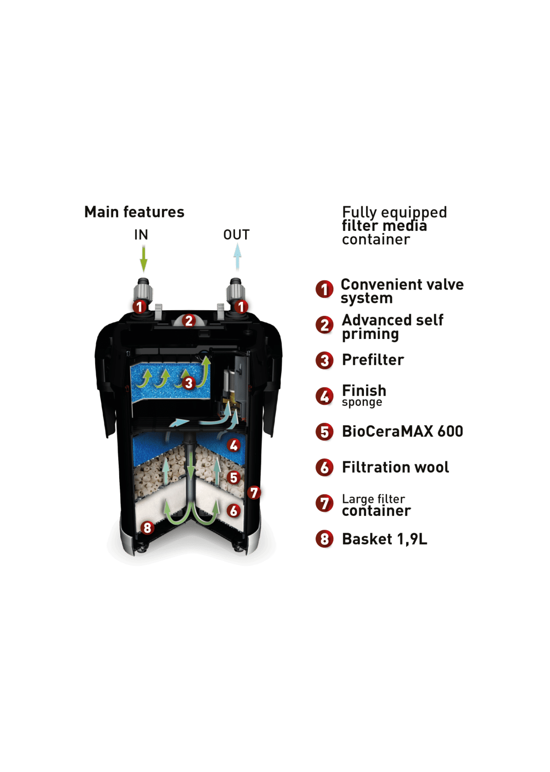 - Prefilter Volume: 0.6 liters (for easy cleaning of large debris)