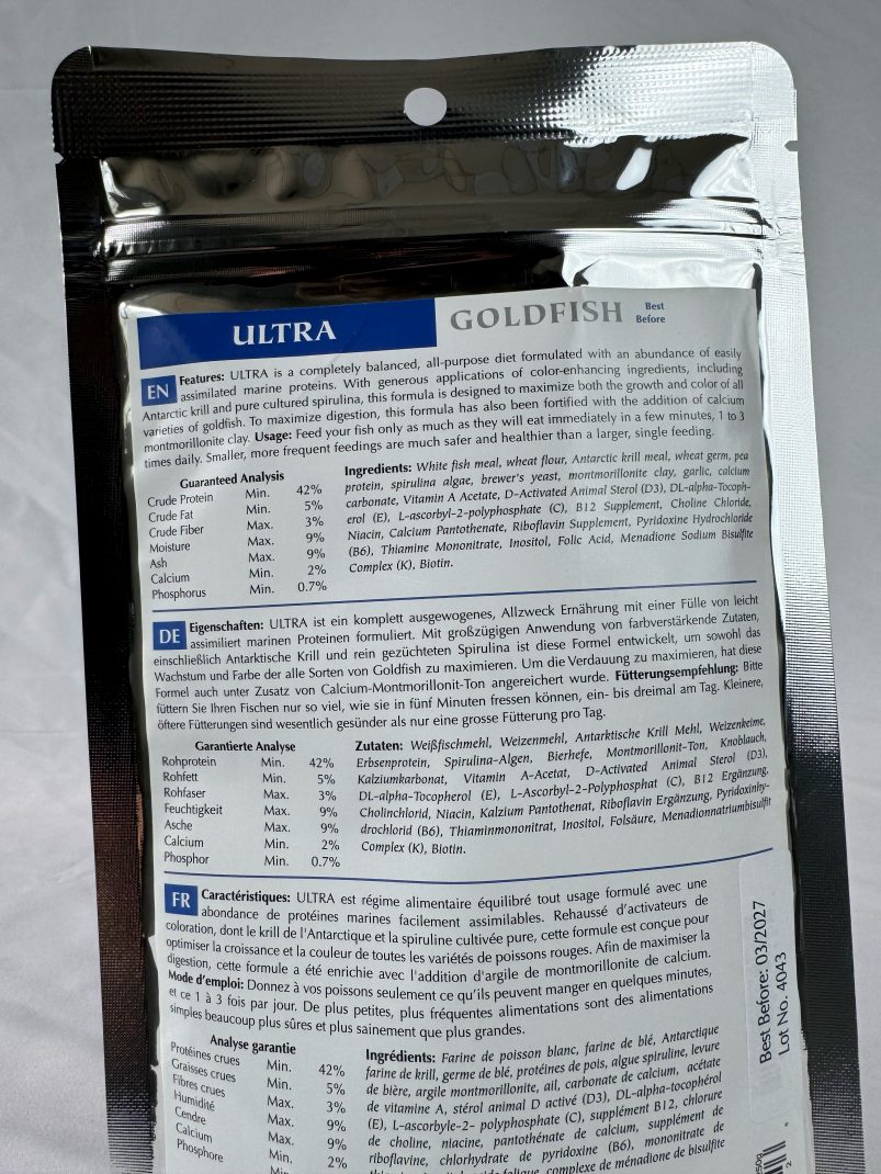 Features: ULTRA is a completely balanced, all-purpose diet formulated with an abundance of easily assimilated marine proteins. With generous applications of color-enhancing ingredients, including Antarctic krill and pure cultured spirulina, this formula is designed to maximize both the growth and color of all varieties of goldfish. To maximize digestion, this formula has also been fortified with the addition of calcium montmorillonite clay. Usage: Feed your fish only as much as they will eat immediately in a few minutes, 1 to 3 times daily. Smaller, more frequent feedings are much safer and healthier than a larger, single feeding.
