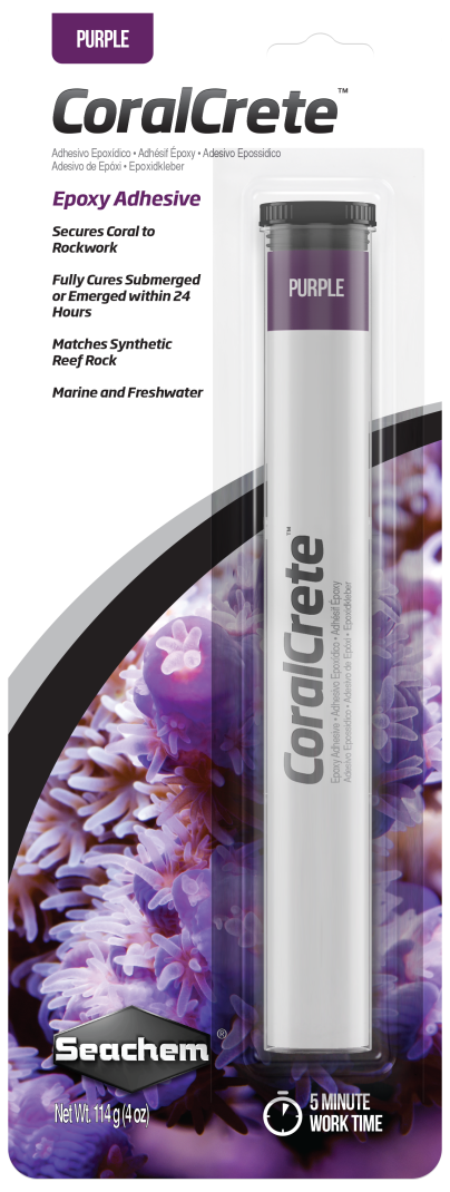 Seachem CoralCrete™ is two-part epoxy putty that can be used to secure coral to rockwork or to fuse together rockwork for more stable foundations in reef aquaria. It has a working time of 5 minutes which allows for plenty of work time while also quickly securing coral or rock. CoralCrete™ is ideal for working with larger colonies of branching coral, most large polyp coral or adhering plating coral to rockwork. CoralCrete™ is safe for aquarium inhabitants when used as directed.