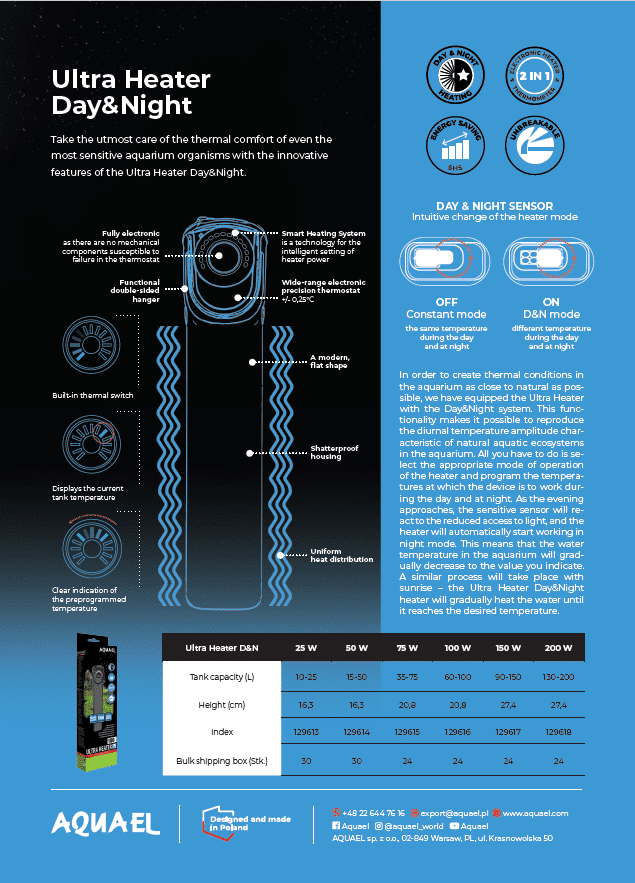The Aquael Ultra Day & Night Heaters offer a unique and innovative solution for aquarium enthusiasts seeking to provide stable water temperatures and simulate natural conditions for their aquatic life. This line of heaters is equipped with a day and night mode function, which helps to recreate the natural temperature fluctuations that occur in nature, promoting the well-being of fish and plants.
